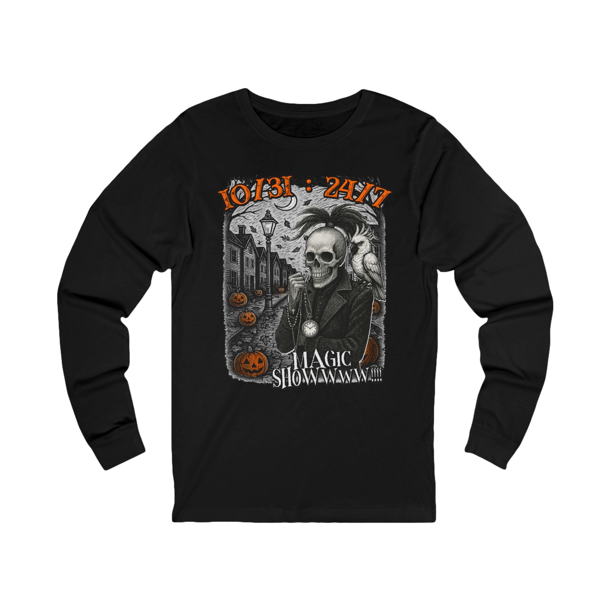 This unisex jersey long sleeve tee is lightweight and breathable featuring color "10/31 : 24/7" Shock Illusionist Dan Sperry : The Anti-Conjuror Skeleton portrait with Spike on a chilly Mid-West Autum Halloween evening...